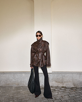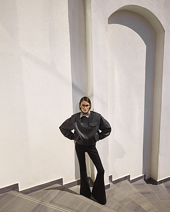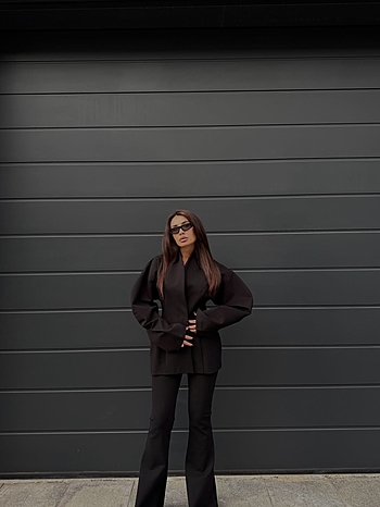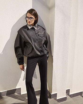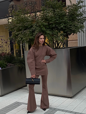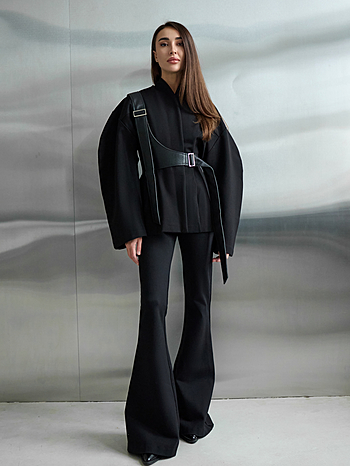 Брюки-клеш плотного прилегания из трикотажа "Джерси" средней посадки без отрезного пояса. Фиксация на боковой потайной молнии и внутренней петле с пуговицей. Карманы отсутствуют. Свойства и состав ткани позволяют сохранять первоначальную форму без деформации.