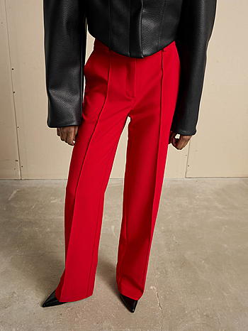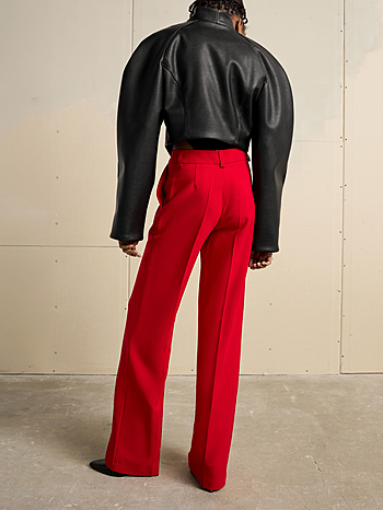 Новая фантазия создать вариацию брюк - классики в свободном прочтении. Средняя посадка, прямой крой, отстроченные стрелки на всю длину, потайная застежка-ремешок на пуговице и крючке, два цвета: натуральный красный и классический черный. Идеальнейшее дополнение для создания костюма - двойки с нашим жакетом мужского кроя из аналогичной ткани.