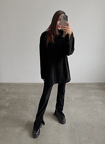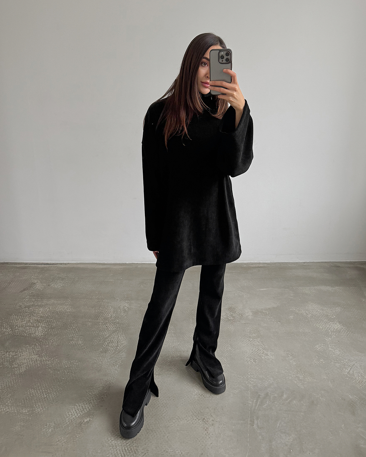 Комплектация к нашему лонгсливу вельвет для полного образа. Посадка брюк на талии на широкой резинке, легкое расклешение брюк к низу, приятная мягкость ворса и натуральный состав.