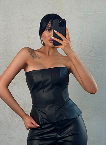 Корсет из эко-кожи на шнуровке. Возможность регулирования посадки по объему и прилеганию. Дополнительные рельефы кроя и регилин для утяжки талии. Жесткая структура изделия и прямой срез верха для приподнимания и подчеркивания груди. Дополнительный элемент на бедрах для акцента на тонкую талию.
