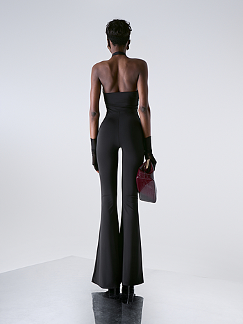 Комбинезон из эластичного трикотажа плотного прилегания без рукавов с брюками клеш.