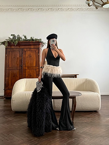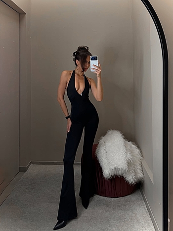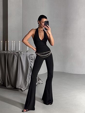 Воротник - петля, длина макси, клеш от колена, обнаженная спинка изделия, завышенная отрезная талия, плотное облегание по фигуре, глубокий вырез, отличная растяжимость трикотажного полотна в основе изделия, эластичные швы