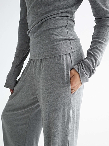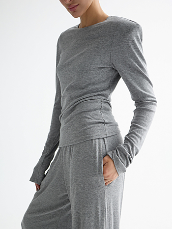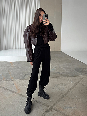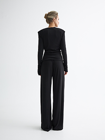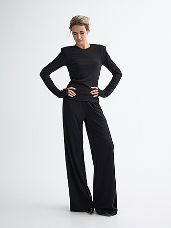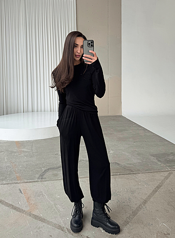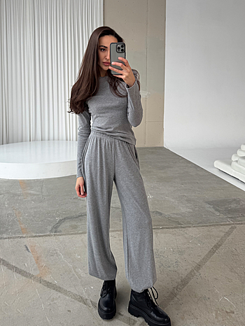 Костюм из вискозного трикотажа свободного кроя. Лонгслив с акцентированными подплечниками и удлиненным рукавом. Брюки на свободном поясе-резинке с карманами.