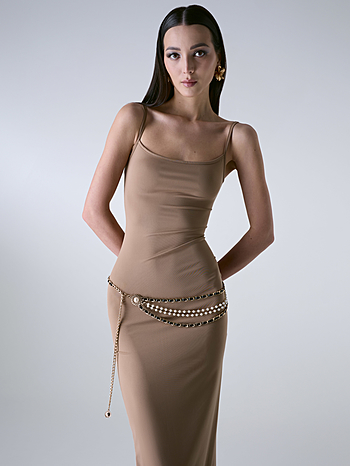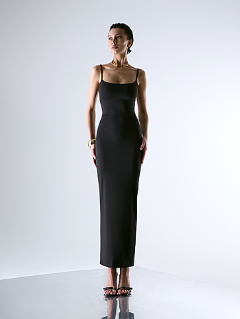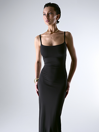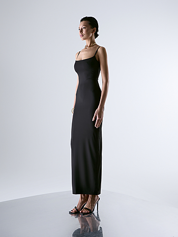Платье-майка плотного прилегания из эластичного непрозрачного трикотажа на тонких бретелях в длине макси. В крое выделена линия бедра для плотного прилегания по талии без складок. Разрез сзади для удобства ширины шага.