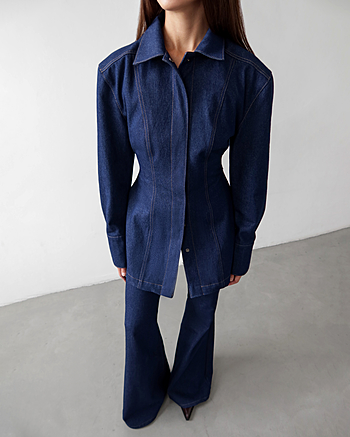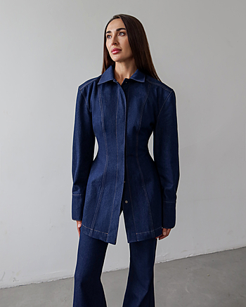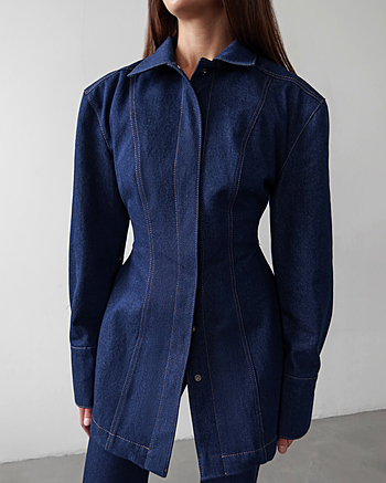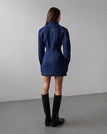 Платье-мини из темной плотной хлопковой джинсы. Силуэт "песочные часы" за счет рельефного приталивания конструкции и расширенной линии плеча. Супатная застежка на кнопках, втачной воротник, увеличенный манжет, умеренно контрастная отстрочка отделочной ниткой.