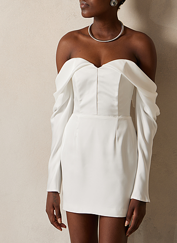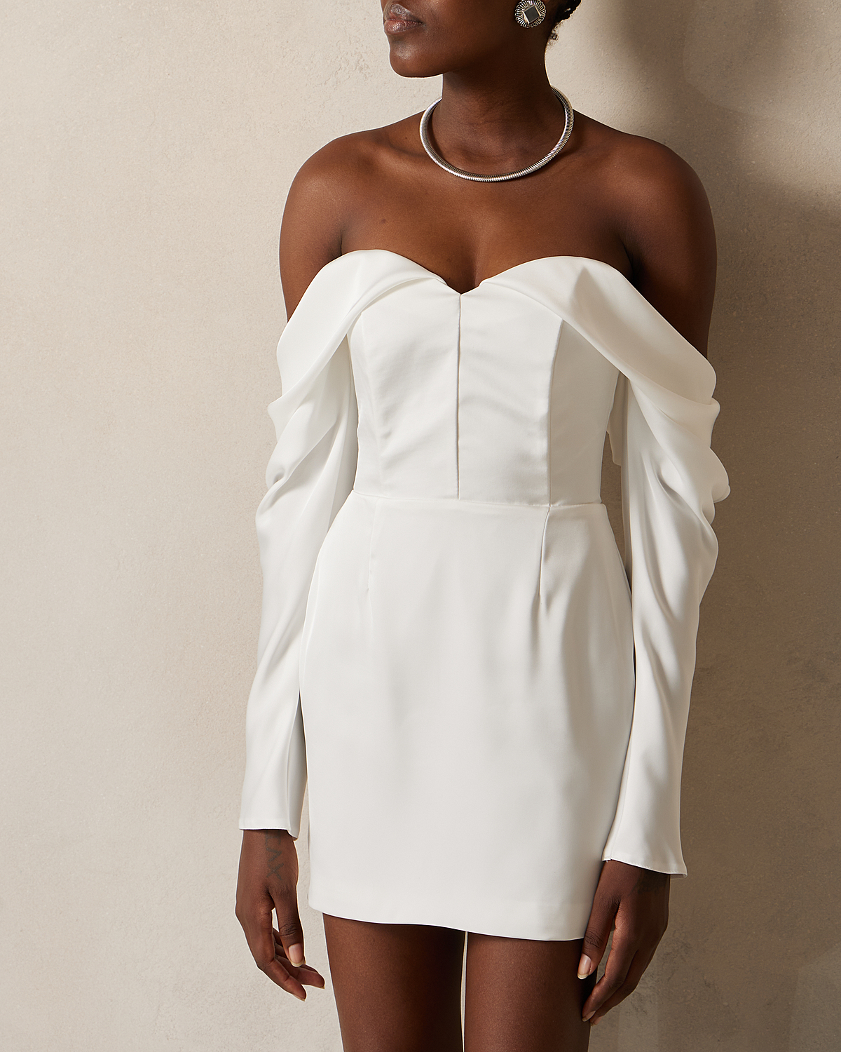 Платье-мини из искусственного шелка с корсетной вставкой, открытыми плечами и рукавом.