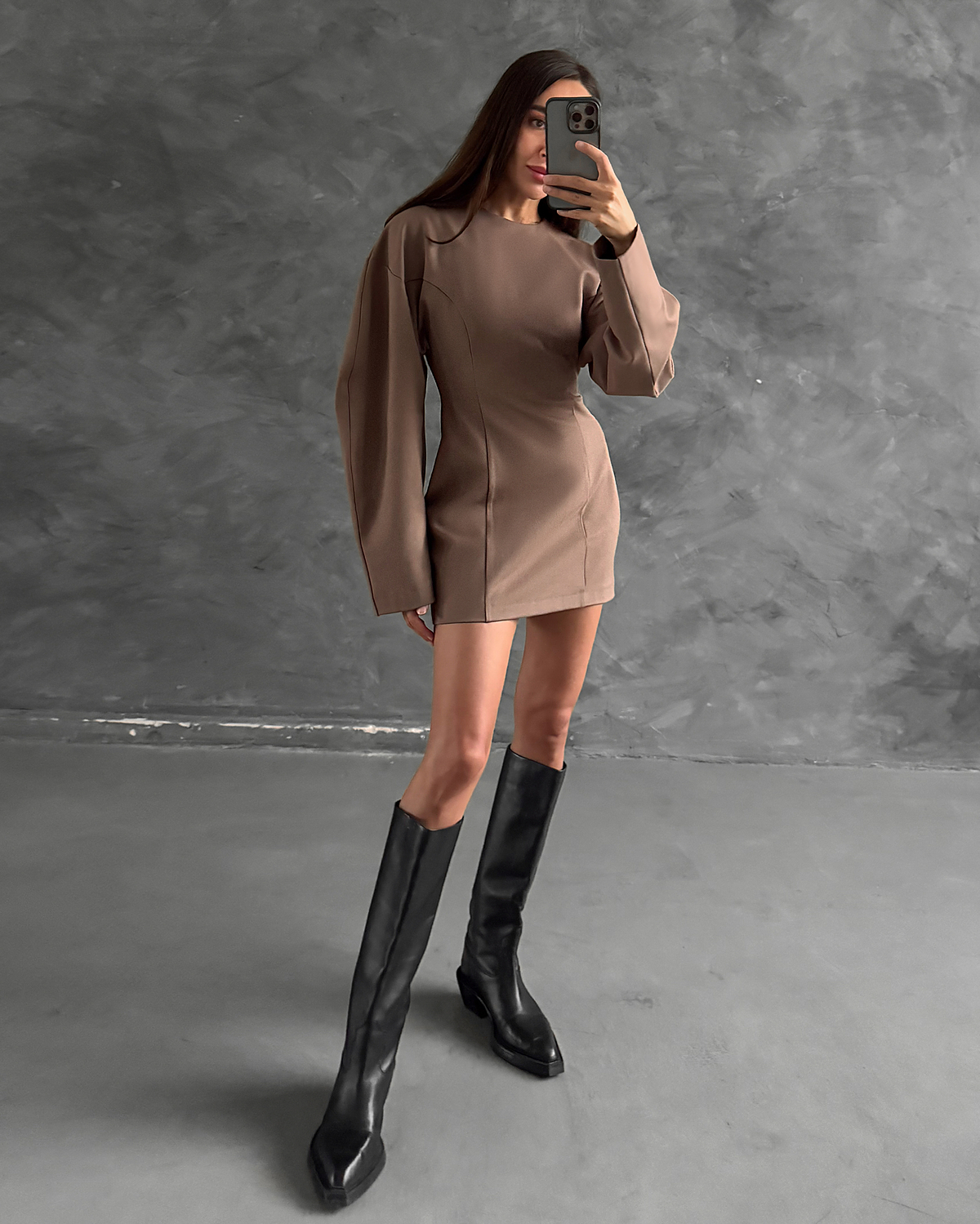 Платье-мини с рельефами из трикотажа "Джерси" высокой плотности. Четко выраженная линия талии, акцент на изгибах фигуры, гипертрофированный рукав. Застегивается потайной молнией на спинке изделия.