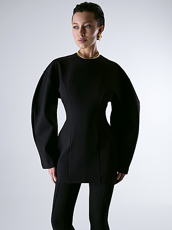 Платье-мини с рельефами из трикотажа "Джерси" высокой плотности. Четко выраженная линия талии, акцент на изгибах фигуры, гипертрофированный рукав. Застегивается потайной молнией на спинке изделия.