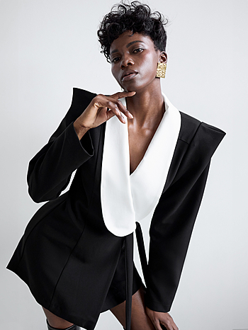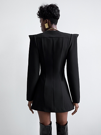 Приталенное платье на запах с воротником-трансформером. Посадка прилегания регулируется с помощью внутренней и внешней кулисы. Акцентированное плечо с защипом, длина мини, плотная костюмная ткань основы, съемный воротник на потайных пуговицах-малютках.