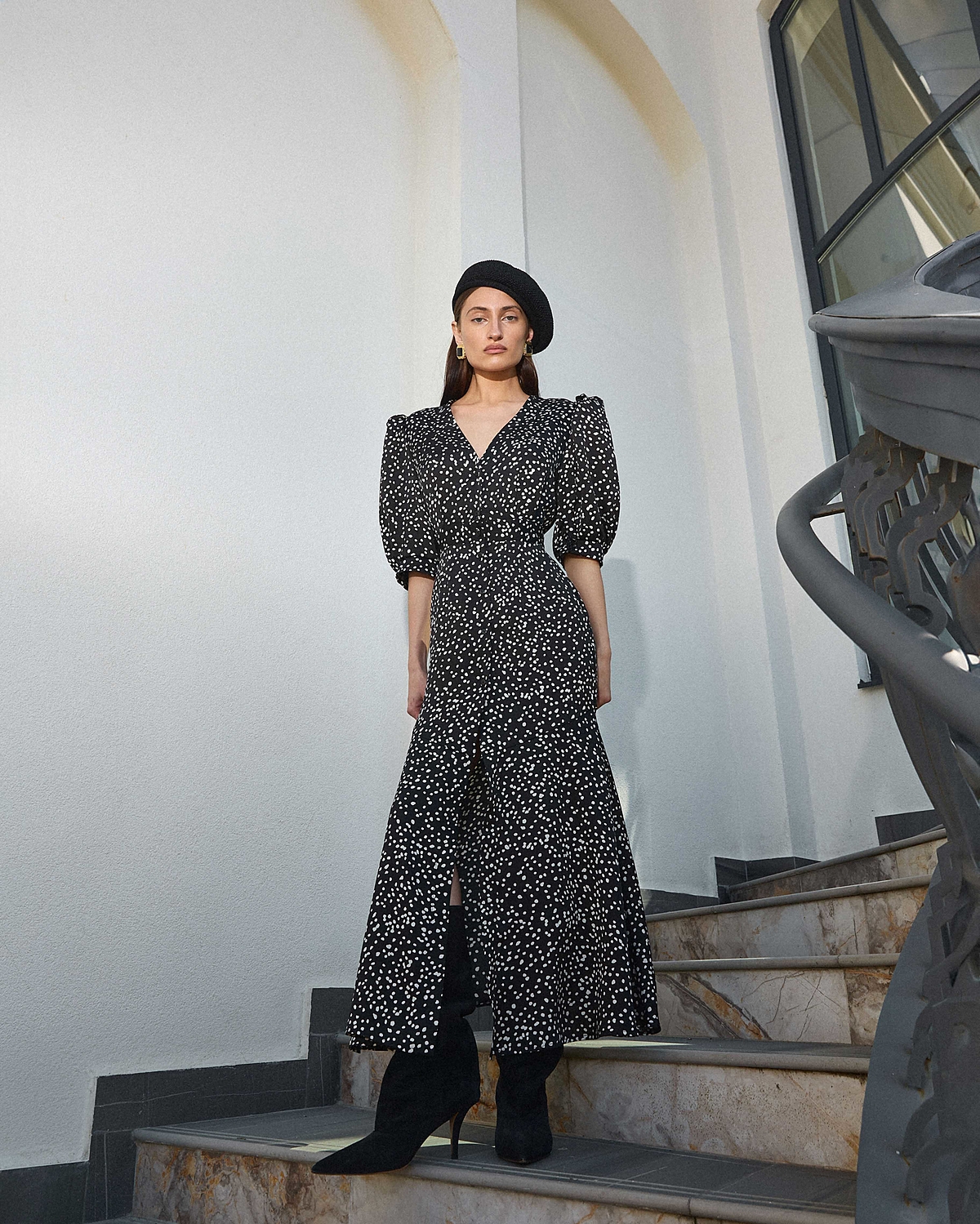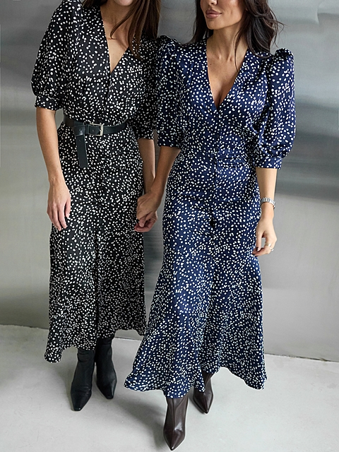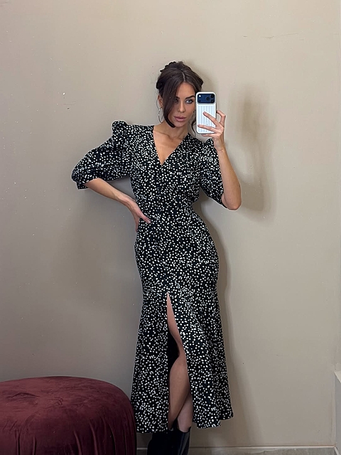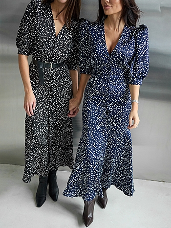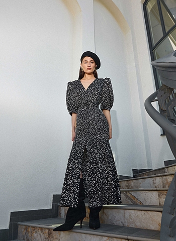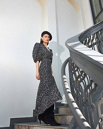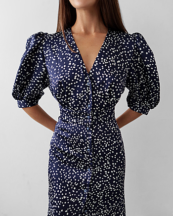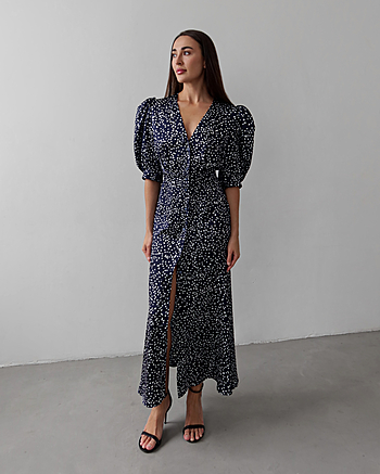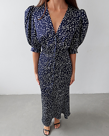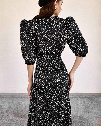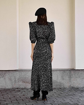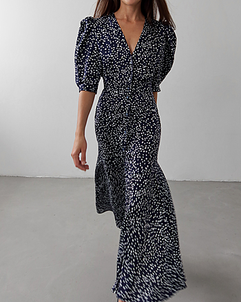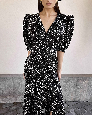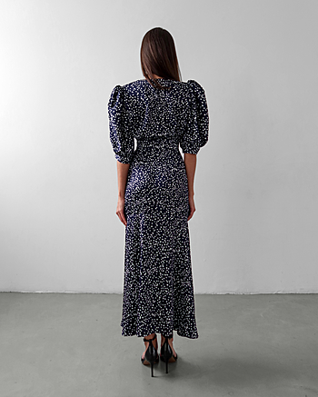 Силуэтное платье из струящейся ткани в горошек. Застежка на пуговках-малютках. V-образный вырез. Для силуэта "песочные часы" использовались конструктивные акценты: объемный рукав-фонарик длиной до середины локтя с регулировкой на двух пуговках, конструкция с отрезной линией талии для плавного прилегания и широкий волан по юбке длиной до щиколотки.