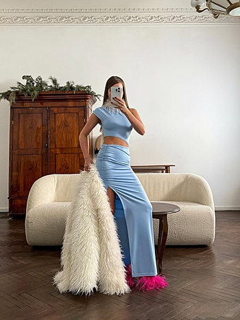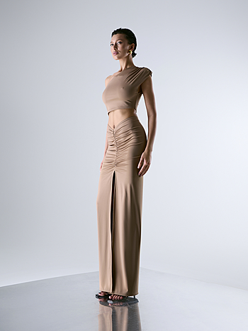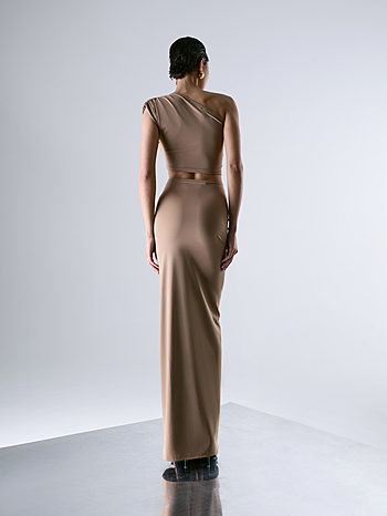 Облегающая юбка с драпировкой и топ на одно плечо из эластичного трикотажа, которые можно совместить в единое платье. Потайная пуговка для фиксации верха и низа возможна при вариации расположения сборки юбки спереди на бедре. Можете располагать юбку на теле любой стороной драпировки на ваше усмотрение без фиксации верха и низа в единое изделие.