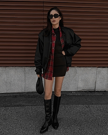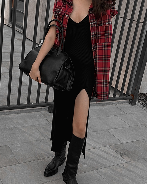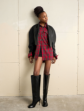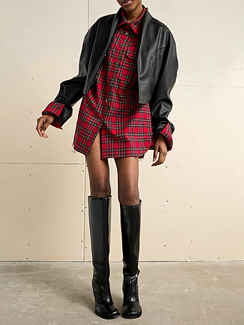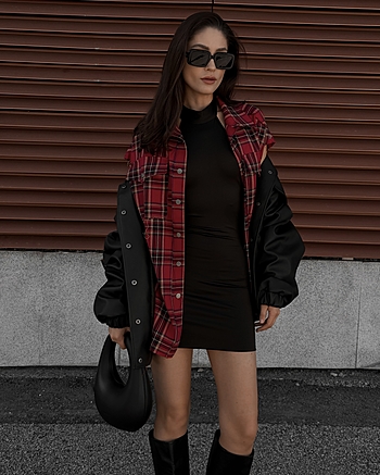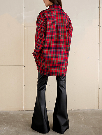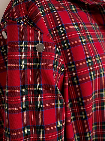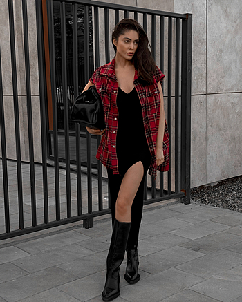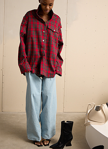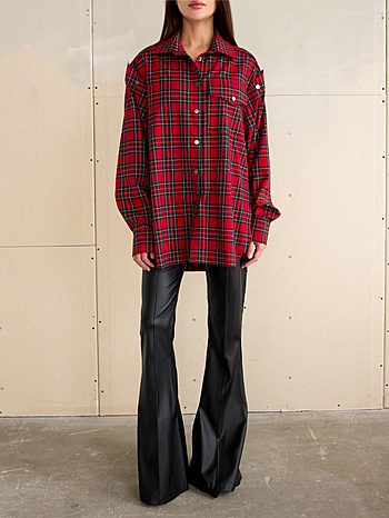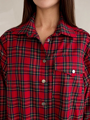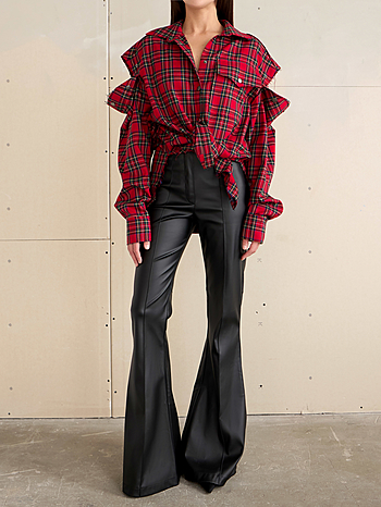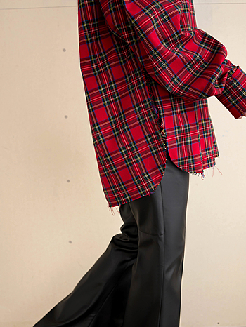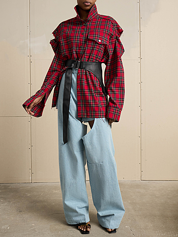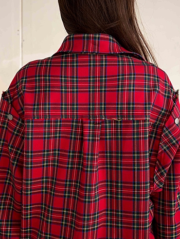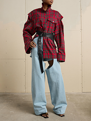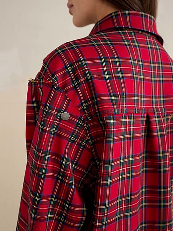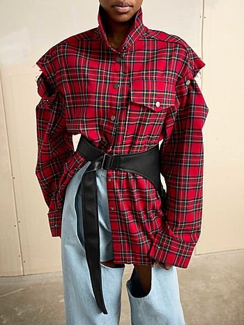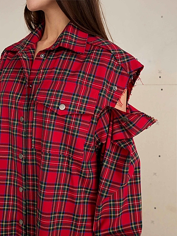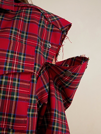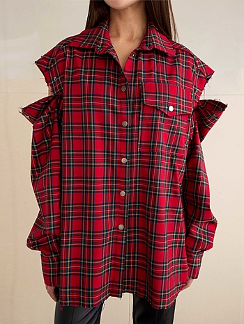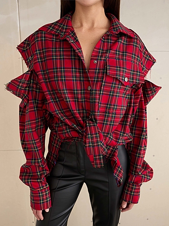 Рубашка свободного кроя из костюмной клетки с необработанными швами. Застегивается на кнопки. Рукава рубашки могут отстегиваться до середины, создавая эффект "отваливающихся".