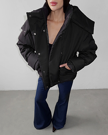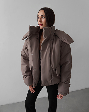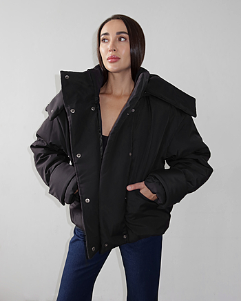 Дутый укороченный oversize пуховик из уплотненной мембранной плащевой ткани с функцией влагоотталкивания. Особенности конструкции в спущенной линии плеча, пухляшах-манжетах на кнопках и объемных карманах-клапанах, отстегивающемся капюшоне со стойкой и потайной застежке на кнопках. Объем по нижней части пуховика можно регулировать кулисой на резинке.
