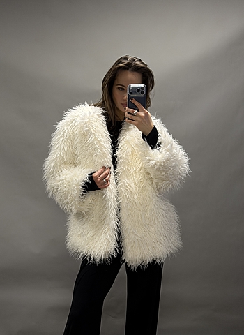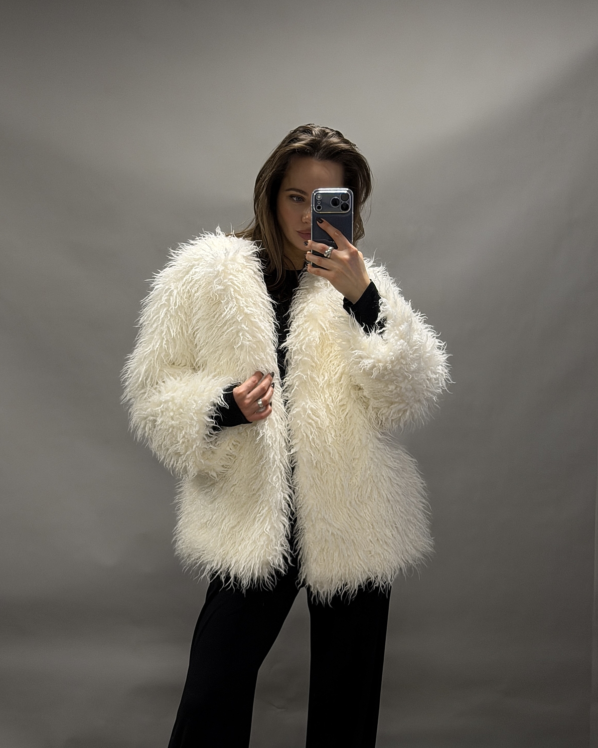 Утепленная шуба свободного силуэта из эко-меха ламы. Длина мини, четыре шубных крючка в застежке, боковые прорезные карманы. Утеплитель - мягкий синтепон с температурным режимом до -20 градусов.