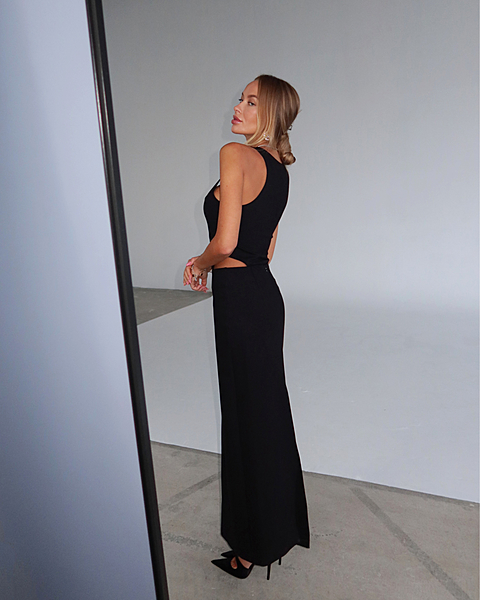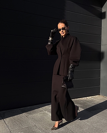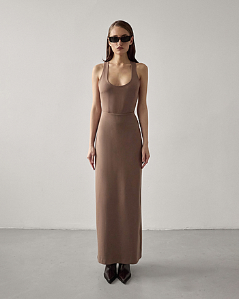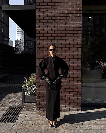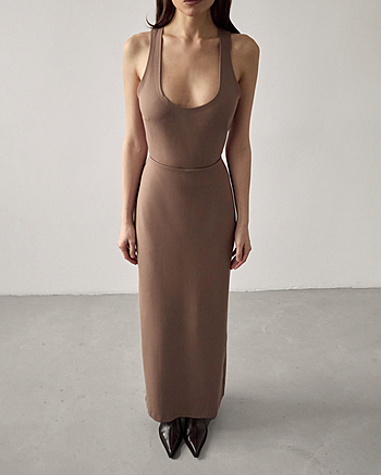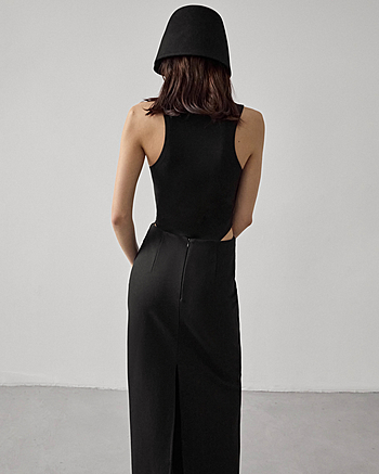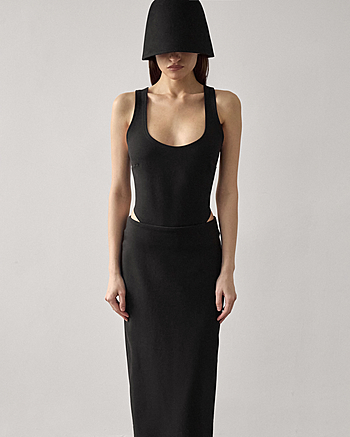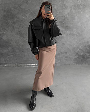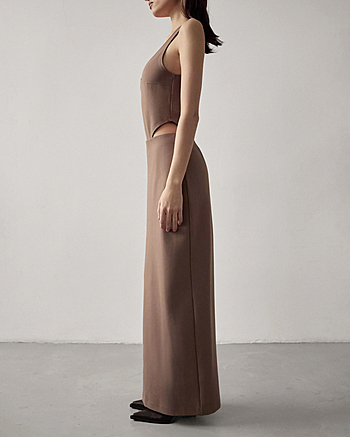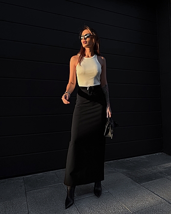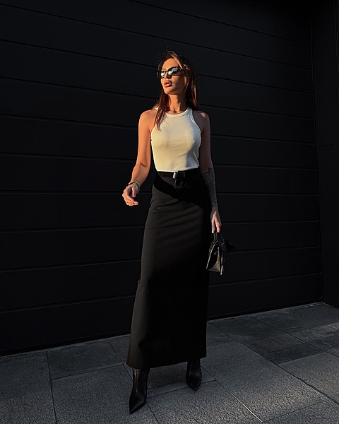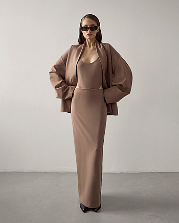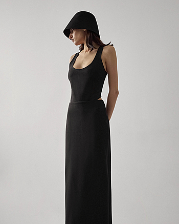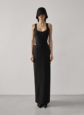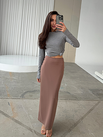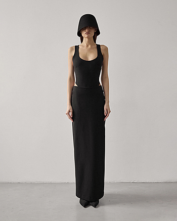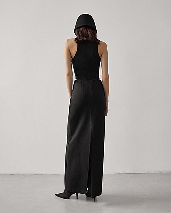 Юбка-макси из плотного трикотажа "Джерси" средней посадки. Застежка на потайной молнии и внутренней петле с пуговицей сзади. Прямой силуэт без отрезной линии пояса на талии.