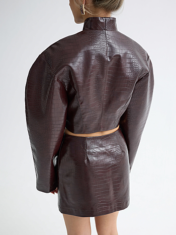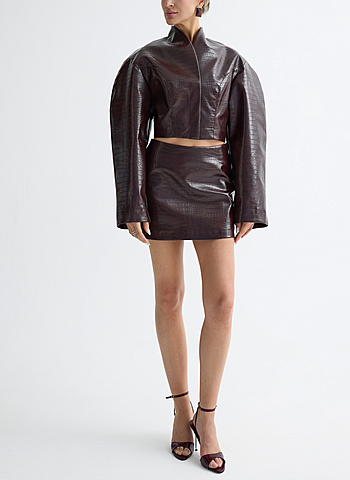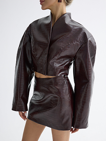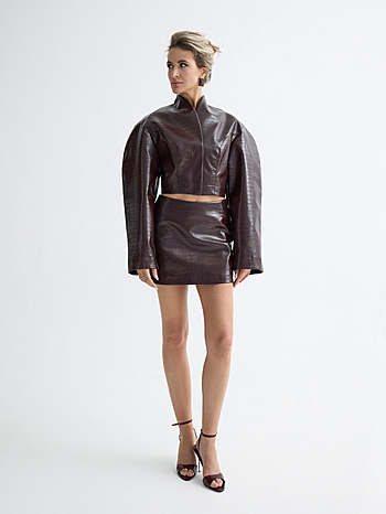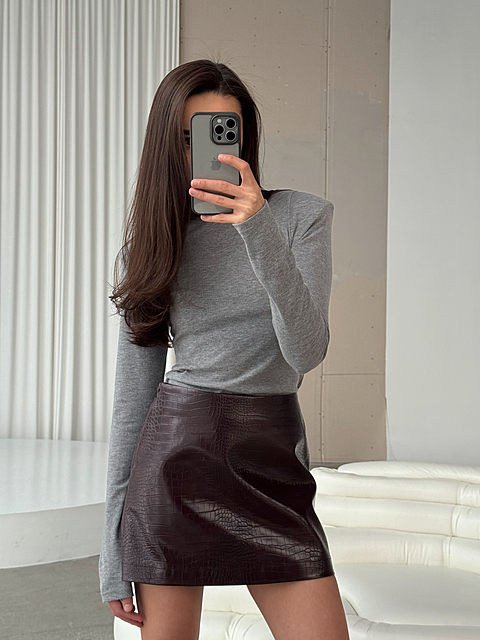 Юбка длины мини силуэта трапеция из эко-кожи лак. Средняя посадка и цельнокройный пояс. Застежка на боковой молнии.