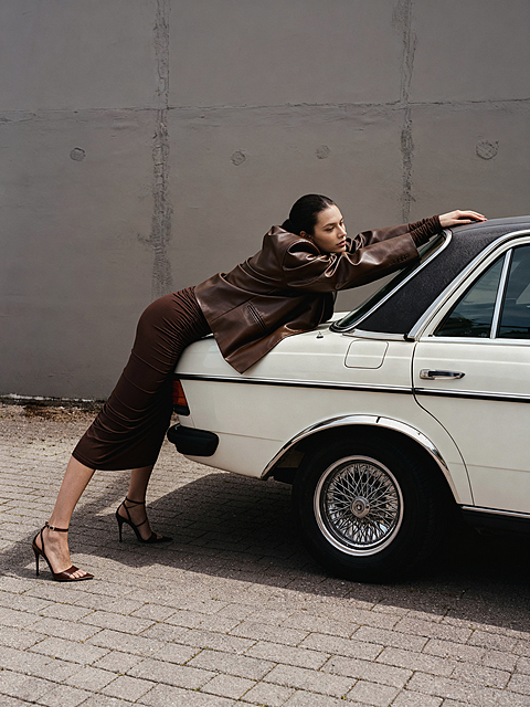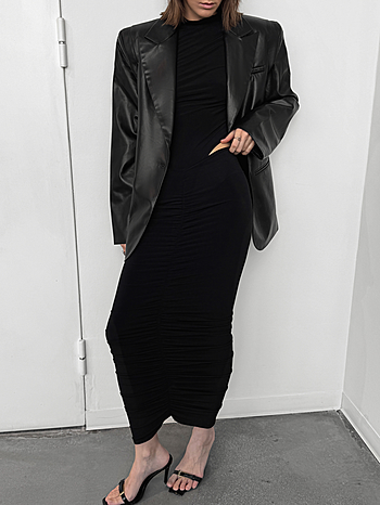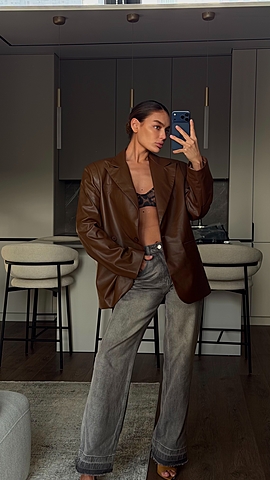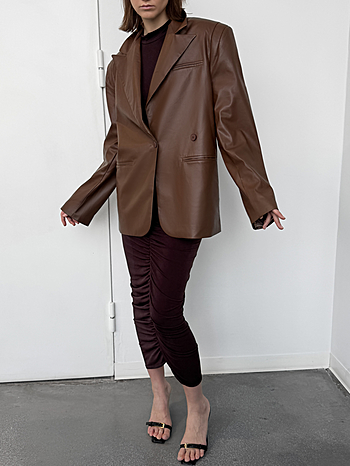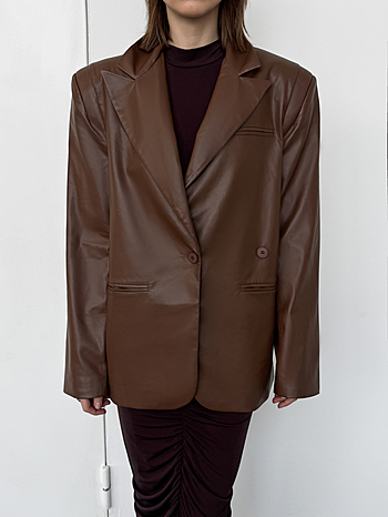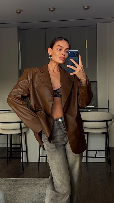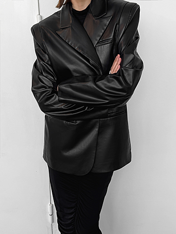 Мягкая кожа создает нечеткость линий, благодаря чему изделие приобретает уютность, гибкость, подвижность и драпируемость. Любые заломы от носки легко расправляются без каких либо манипуляций. Застежка из двух пуговиц на разном расстоянии друг от друга поможет создать более свободный или приталенный силуэт. Не можем не отметить уникальный крой плеча с дополнительной вытачкой.
